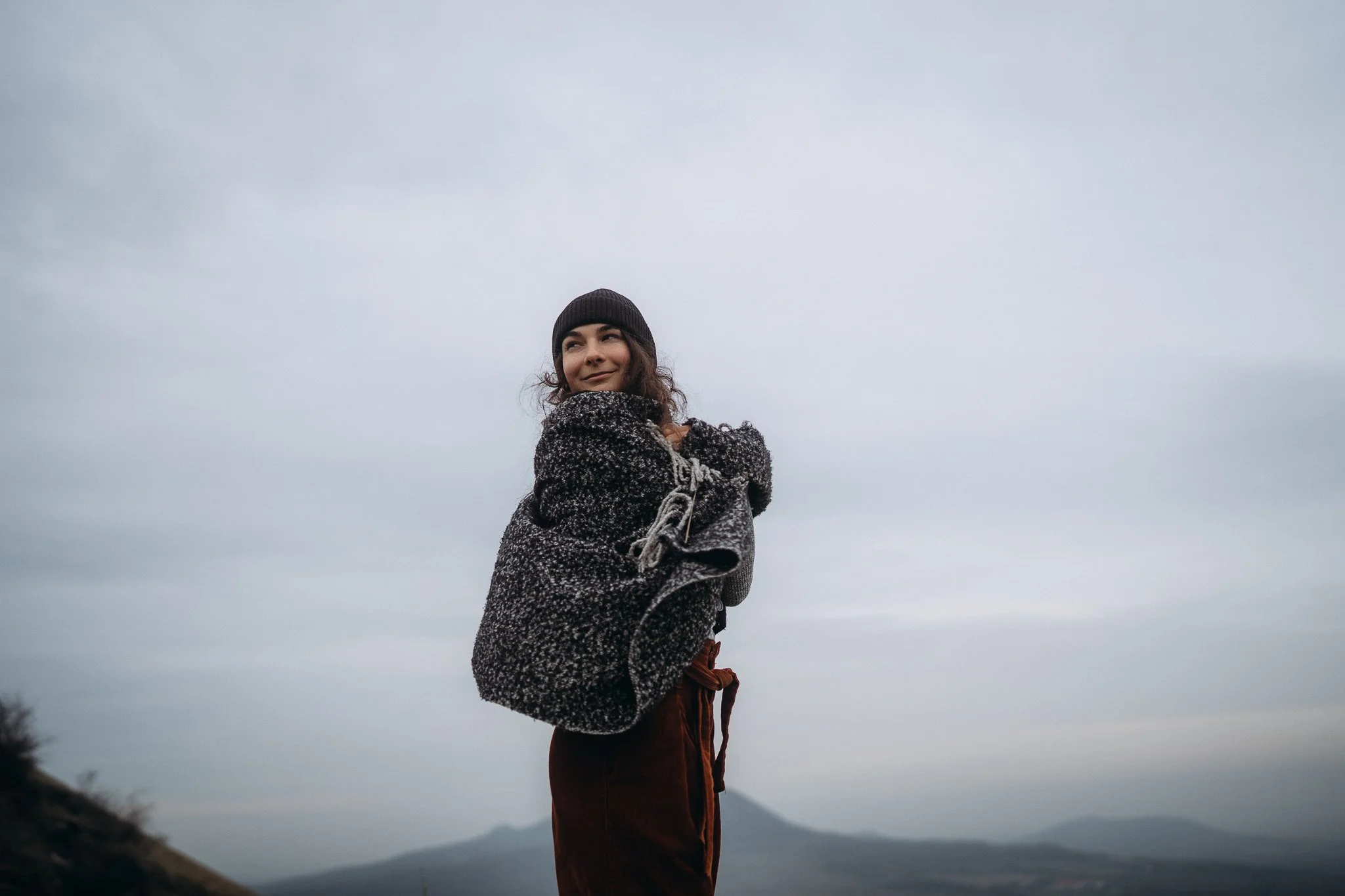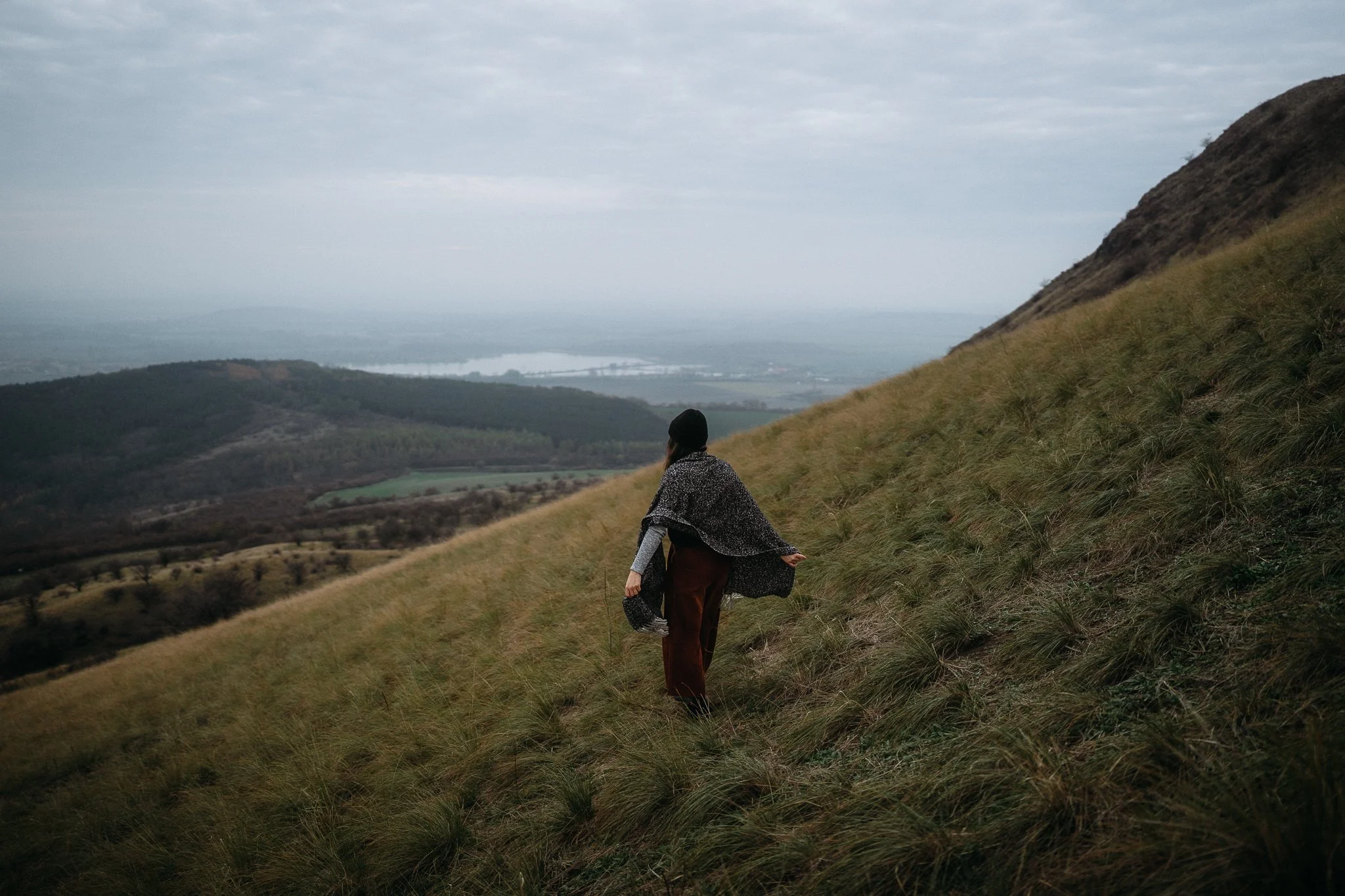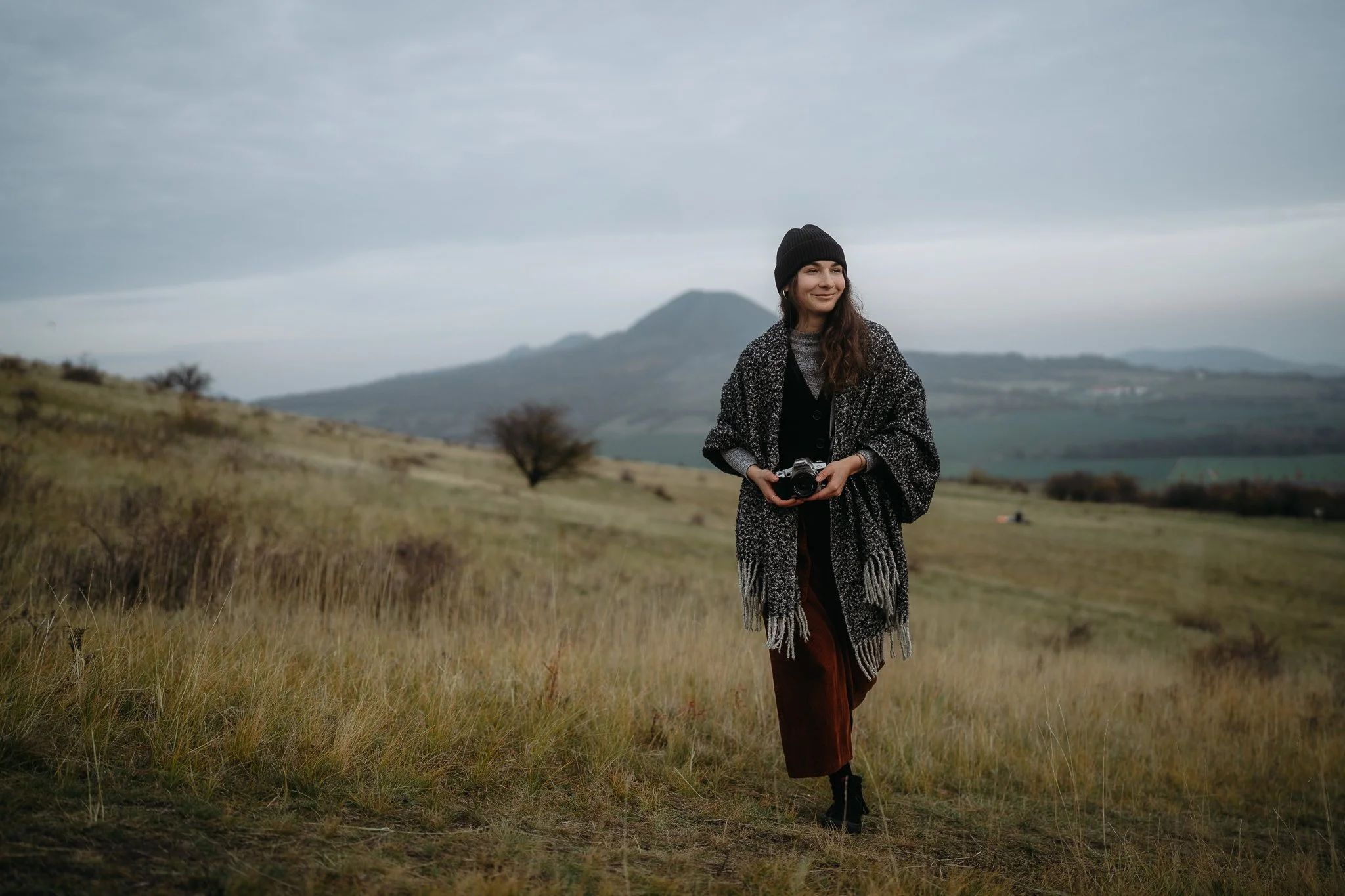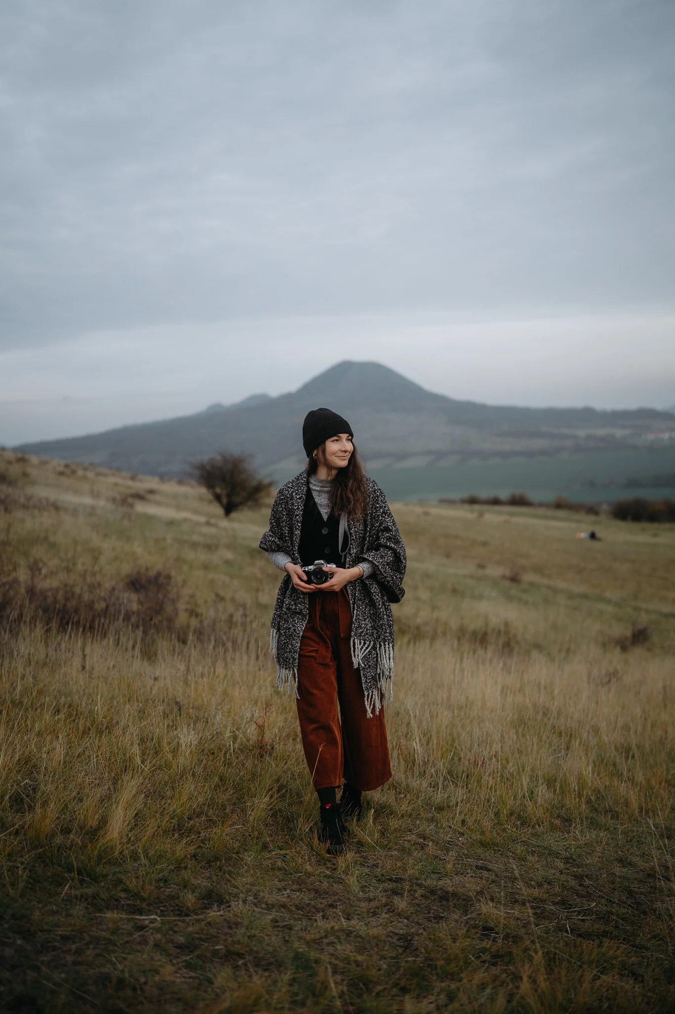 Přijela jsem za Zuzkou — fotografkou, která se tentokrát ocitla na druhé straně fotoaparátu. Sešly jsme se na kopci Raná v Českém středohoří, asi hodinu za Prahou. A i když se slunce ten den rozhodlo zůstat skryté, mělo to svou magii. Krajina působila skoro jako někde na Islandu. Syrová, tichá, nádherná.