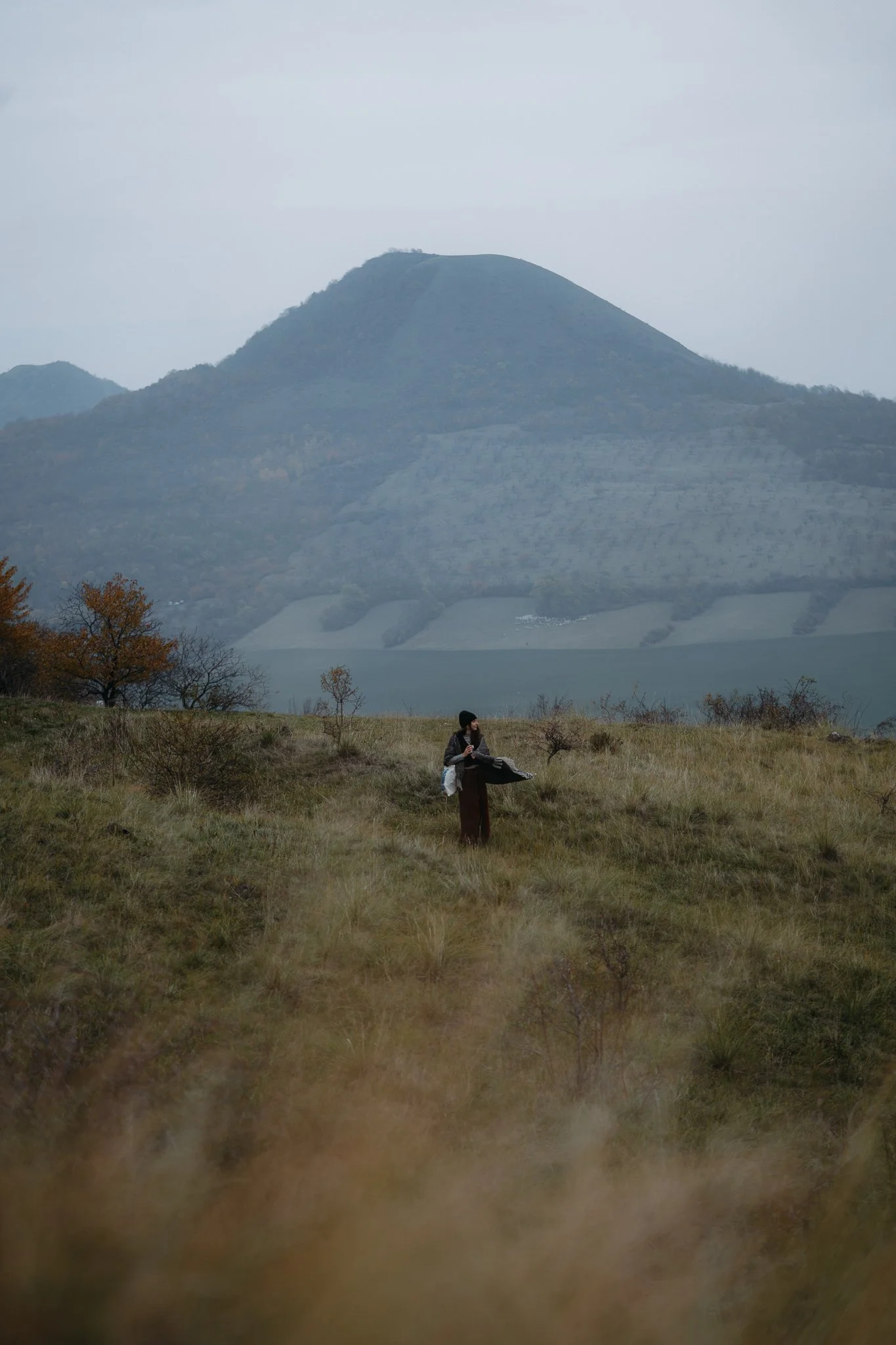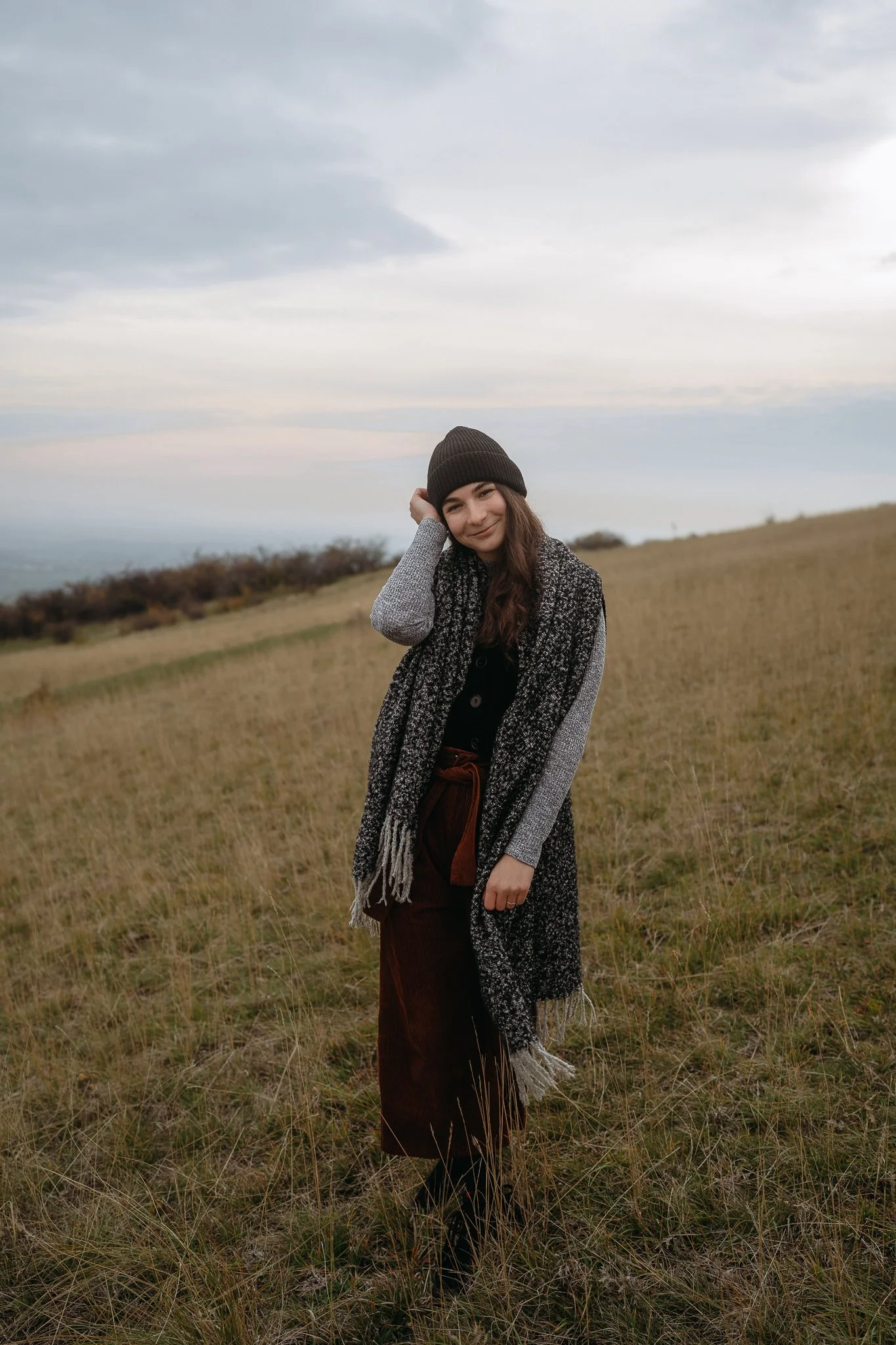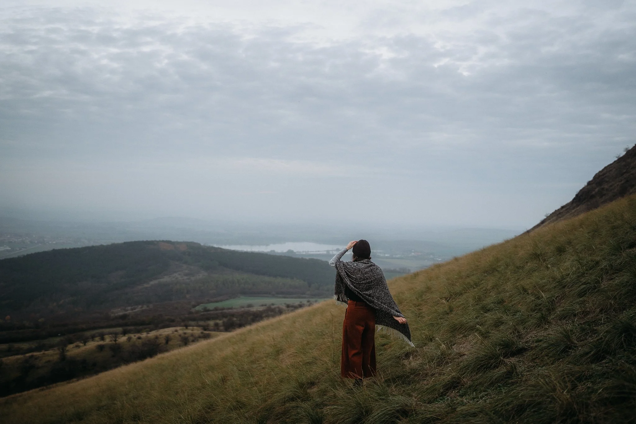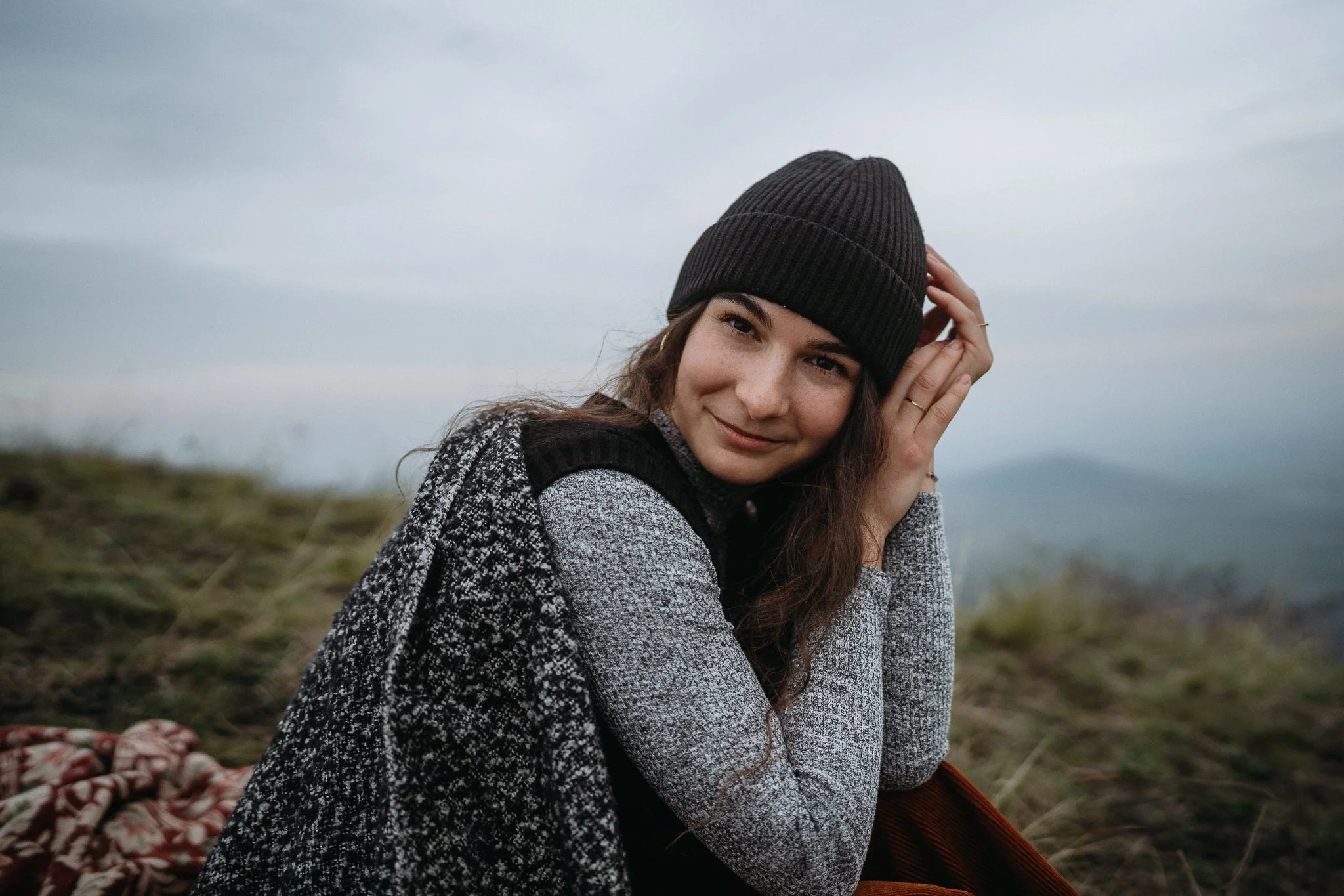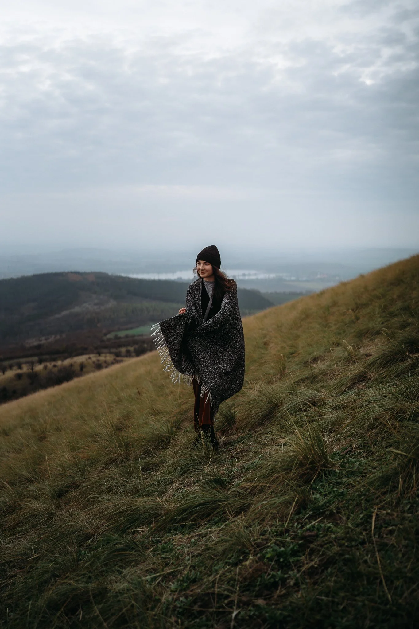 Přijela jsem za Zuzkou — fotografkou, která se tentokrát ocitla na druhé straně fotoaparátu. Sešly jsme se na kopci Raná v Českém středohoří, asi hodinu za Prahou. A i když se slunce ten den rozhodlo zůstat skryté, mělo to svou magii. Krajina působila skoro jako někde na Islandu. Syrová, tichá, nádherná.